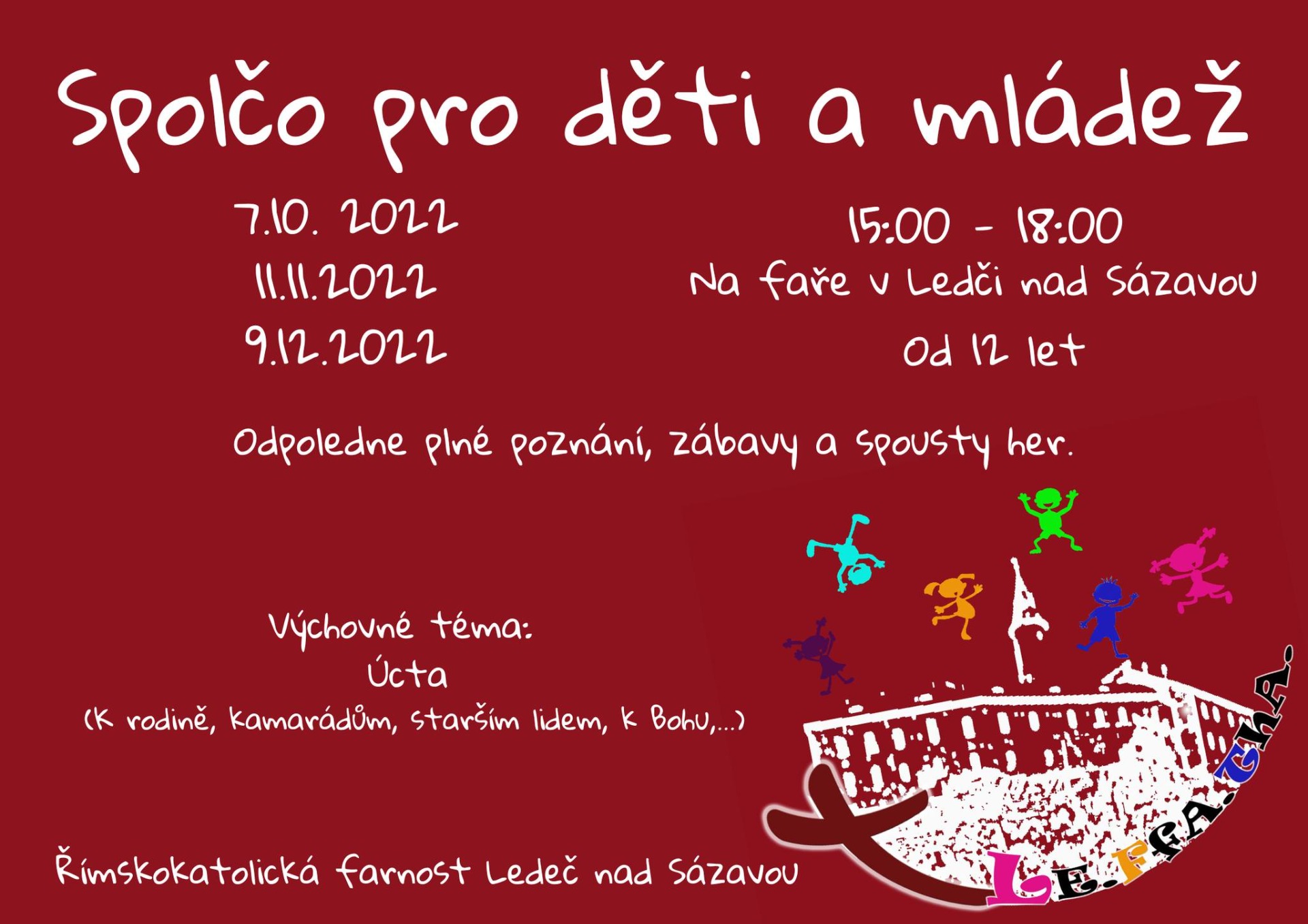 Ahoj, chtěli bychom všechny děti od 12 let pozvat na pravidelná spolča (1 krát za měsíc) na faře v Ledči nad Sázavou. Spolča bude připravovat Martička Urbánková s Honzou Hofmanem. Čeká vás odpoledne nabitých her spolu s tématem o úctě, na které každý měsíc budete navazovat. Moc se na Vás všechny těšíme!